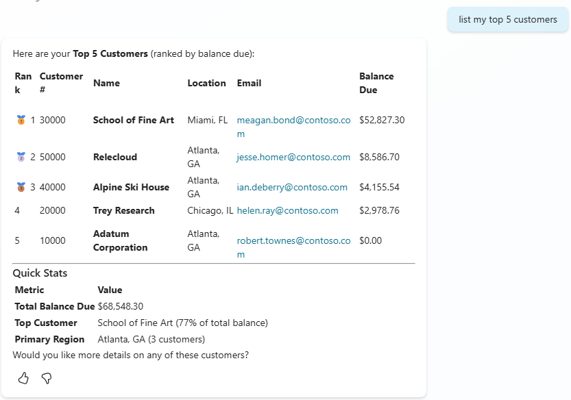 With a single question, the agent analysed live Business Central data and returned a ranked list of customers based on balance due — including totals and key highlights.